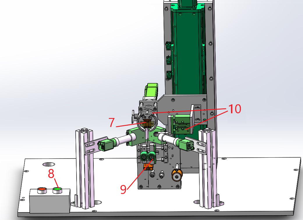 2.按下图示8所示按钮松开位置9所示胶辊,延时设定松开位置10所示气缸和下降电缸30mm,取走多余光纤完成一套循环动作。